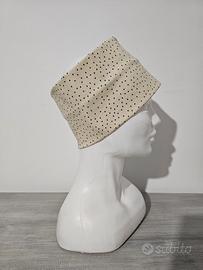 fascia per capelli in cotone elasticizzato. Base di colore beige con piccoli pois di colore grigio. Fascia alta misura 12 centimetri. Circonferenza 52 centimetri. si può piegare su se stessa per una fascia con larghezza inferiore (come da foto).