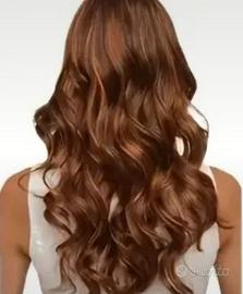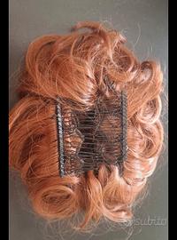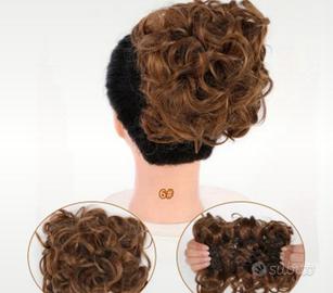 2- Chignon sintetico riccio spettinato con 2 fermagli a pettini in plastica inseriti per l'aggancio ai propri capelli. Colore castano.