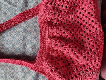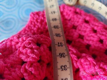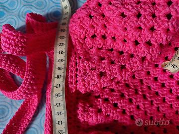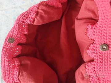 borsa granny square colore fucsia in cordino thai. interamente fatta a mano. foderata Internamente chiusura a calamita. per le misure vedere foto ( prima dell'arricciatura il quadrato misurava 42cm). manici 40cm ca. mai utilizzata