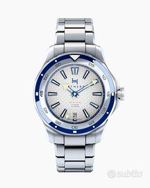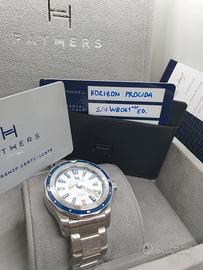 Vendo per inutilizzo splendido Orologio del Brand Tutto Italiano Fathers. Modello più iconico della loro collezione Il Diver Horizon nella variante colore PROCIDA. L'orologio è nuovo, completamente pellicolato, mai indossato, mi è stato regalato per il mio compleanno.. ed è un peccato tenerlo fermo! Corredo completo con anche il suo portadocumenti in pelle (utilizzabile anche come porta tessere) con Referenza modello, giorno di acquisto e garanzia firmata. Garanzia valida fino a Maggio del 2027. Ha un prezzo di vendita di 1.310 euro Potete verificare voi stessi sul sito ufficiale. Nonostante sia nuovo io lo propongo ad un prezzo di Usato come se fosse un secondo polso! EURO 750. IL PREZZO è da ritenersi assolutamente INTRATTABILE. Tutti i messaggi con richiesta di trattabilità o con offerte al ribasso del prezzo richiesto verranno ignorate, SOLO REALMENTE INTERESSATI. NO PERDITEMPO Si preferisce lo scambio a mano, ma posso anche spedire, non con subito e pagamento anticipato! Max Serietà! Di seguito vi lascio le caratteristiche tecniche: Orologio diver automatico movimento automatico Swiss Made Sellita SW200-1 (42h di autonomia), cassa robusta in acciaio 316L Ø40mm con trattamento antigraffio. Impermeabilità:20 ATM / 200 metri / 20 bar Vetro:Zaffiro piatto con rivestimento antiriflesso. Spessore 3,20 mm Lunetta:120 scatti unidirezionali. Acciaio 316L con inserto in un unico stampo in ceramica Quadrante: Bianco perla, monogram in rilievo, con trattamento oil press Corona A vite Superluminova:C3 SLN Fondello: SS, satinato e serrato con sei viti per una totale impermeabilità Spessore: 11.9 mm Lug to Lug: 48 mm Distanza tra le anse: 20 mm Diametro cassa: 40 mm Peso:156 g Movimento: Swiss Made Automatic Sellita SW200-1 Bracciale in acciaio 316L finissima finitura satinata AAA. 20/18 mm con terminali pieni. Fibbia a Farfalla, SS liscio e spazzolato con clip di sicurezza. Prodotto Originale e di lecita provenienza!