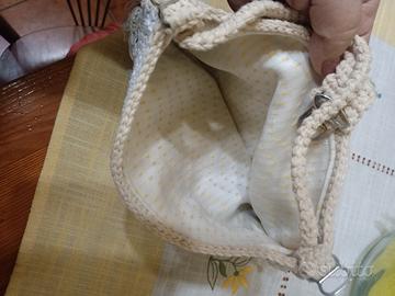 Borsetta di jeans ed uncinetto, foderata. Pezzo unico. Misure 25 cm di larghezza e altezza 17 cm
