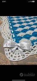 Copertina in lana che ho realizzato all' uncinetto in due colori. I fiocchetti li ho realizzati con nastro di raso. Per misure e altri dettagli sono a disposizione