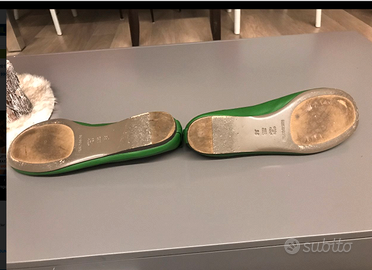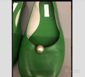 ESCLUSIVE e SUPERGLAM ballerine realizzate in morbida pelle nappa, originale dettaglio Perla, fodera in pelle, suole in cuoio, Made in Italy, colore verde. Articolo autentico attuale collezione "CANAGLIA" di FAUSTO SANTINI. Calzano nr38. CONDIZIONI: PRATICAMENTE NUOVE indossate per poche ore ad un evento, da vagliare quale IDEAREGALO. Prezzo RETAIL 280euro!