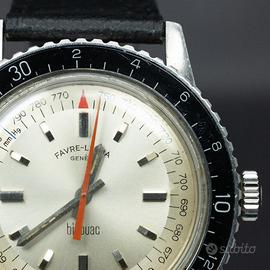 - Marca: Favre Leuba - Modello: Bivouac - Anno di produzione: Anni 60 - Diametro cassa (corona esclusa): 40mm - Materiale cassa: Acciaio - Materiale bracciale: Pelle - Movimento: Manuale - Corredo: Solo Orologio