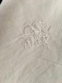 fazzoletto in cotone bianco con bordo operato in rilievo e piccolo ricamo floreale probabilmente fatto a mano riportante la lettera E in corsivo