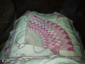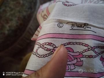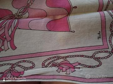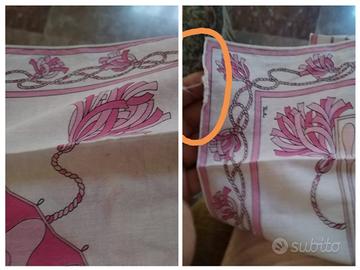 Delizioso fazzoletto in cotone, rosa e fucsia, Emilio Pucci, a fantasia floreale. Presenta purtroppo un buco, visibile in fotografia, dove l'ho evicon circolo arancione e ha un bordo, dove forse era presente l'etichetta mancante, che non è integro, ma un po'sfrangiato. Le misure :42,5 centimetri x 42 centimetri. Senza imballaggio originale