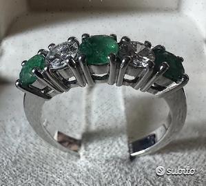 ANELLO FEDINA A 5 PIETRE IN ORO BIANCO 750°/°° - 18 carati CON SMERALDI NATURALI DI TAGLIO TONDO E DIAMANTI* NATURALI TAGLIO BRILLANTE n° 3 SMERALDI ct. : 0,67 n° 2 DIAMANTI ct. : 0,46 colore G - purezza VS PESO ORO gr. : 4,50 MISURA DEL DITO: 15 1/2 ( possibile cambiare misura dell'anello per qualsiasi informazione contattateci) altre foto a richiesta via email spedizione con assicurata tramite Poste Italiane