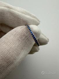 La montatura sottile e armoniosa è impreziosita da una fila continua di zaffiri blu, selezionati per intensità di colore e brillantezza, che donano al gioiello un tocco distintivo e sofisticato.