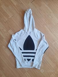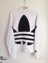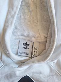 Felpa con cappuccio Adidas, bianca con logo trifoglio nero grande. Ottime condizioni, unico difetto manca la coulisse al cappuccio. Taglia XS uomo.