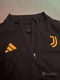 Felpa Adidas della Juventus nera con dettagli gialli. Sulle maniche, strisce bianche con buchi per i pollici e nella parte superiore ha una mezza cerniera . Tessuto leggero.