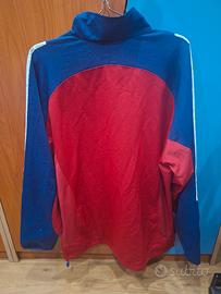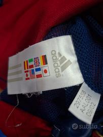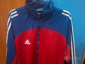 tuta Adidas Originals vintage stile anni '90, caratterizzata dal classico design a blocchi di colore rosso e blu navy con le iconiche tre strisce bianche sulle maniche #adidas #giaccaadidas #tutaadidas #sport #giaccasportiva #tutasportiva #vintage #anni90
