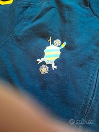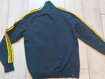 Colore blu navy, con le classiche 3 strisce gialle sulle maniche e logo Adidas sul petto.
