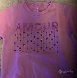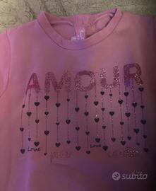Felpa da bambina in colore rosa con scritta “AMOUR” decorata da cuoricini pendenti. Taglia 24 mesi. Dettagli romantici con maniche a volant arricciato che danno un tocco femminile e delicato. Girocollo classico, tessuto morbido in felpa leggera. Perfetta per la mezza stagione. Condizioni buone, capo dolce e trendy per bambine. Design francese chic con stampa glitterata.