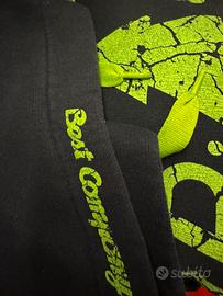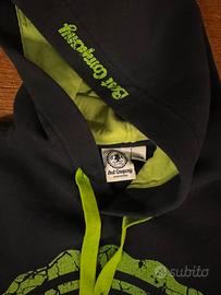 Calda felpa nero e verde, con scritta frontale e dettaglio sul cappuccio. Cordoncino verde a contrasto nel cappuccio.