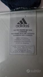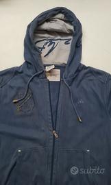 felpa blu con cappuccio tasche e cerniera con stampa nel cappuccio e sul davanti. logo Adidas ricamato. misure... petto60....fondo48... lunghezza 66