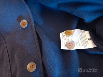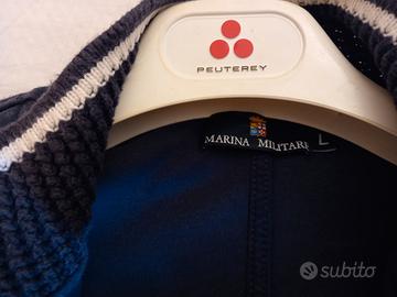 Felpa blu navy "Marina Militare" taglia L, stile college con dettagli bianchi su colletto e polsini. Chiusura a bottoni, tasche frontali ampie e stemma ricamato sul petto. Linea maschile, vintage sportivo, perfetto per look casual o retrò. In ottime condizioni, caldo e comodo.