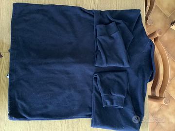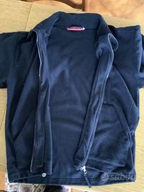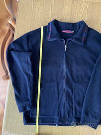 Felpa blu uomo in pile con morbida cerniera, due tasche e lacci elastici alla base. Le misure come da foto e le considero adatte ad un uomo che porta la taglia 54/56 anche se sulla etichetta c’è una L. Non ha scuciture