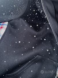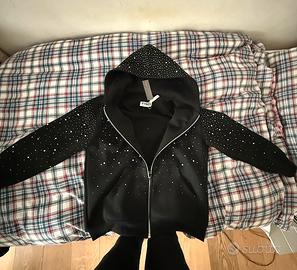 Felpa con brillantini di ottima qualità indossata solo una volta per provarla e basta perché mi stava grande, i brillantini più grossi sono attaccati con un chiodino per cui non verranno mai via mentre quelli più piccoli sono incollati dunque è consigliabile un lavaggio delicato se possibile a mano, zip in metallo, scorre bene.