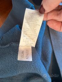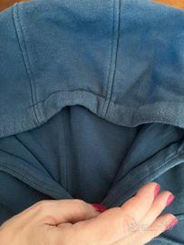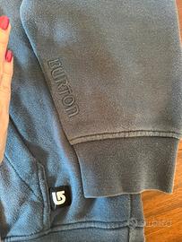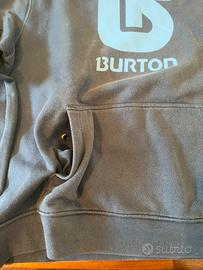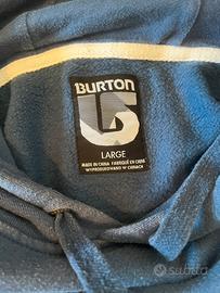 Felpa Burton, taglia L, con cappuccio chiuso da cordino, colore blu / azzurro carta da zucchero (il colore reale si vede nelle foto delle etichette), 80 % cotone, 20 % poliestere, tasca frontale a marsupio, all’interno ha un taschino e un foro per un cavo. Scritta ricamata sulla manica, logo vicino alla tasca, logo centrale in azzurro. Misure: spalle 49 cm, petto 62 cm, lunghezza 67 cm. Felpata internamente, ottime condizioni