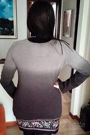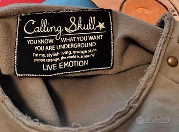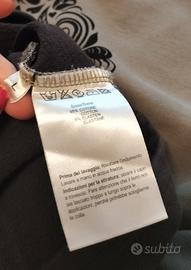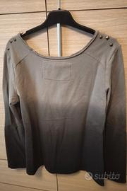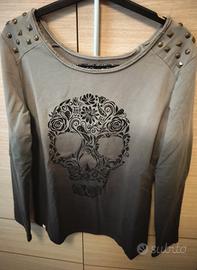 Felpa maniche lunghe ,girocollo,borchie dorate sulle spalle ,stampa di un teschio nero sul davanti .Di color verde militare sfumato in tonalità più scura dal seno /metà schiena in giù Taglia L ,Dimensioni : 41 cm larghezza spalle,46 cm larghezza sotto ascelle ,63 cm lunghezza totale.Di cotone 95% ,elastan 5%.Logo del brand presente nella parte interna della felpa ,al posto della nuca.Stellina rossa ,tipica del brand,presente alla base del capo.Cinsegna a mano ad Arcore,Monza e Milano.Ottime condizioni.
