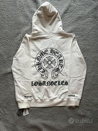 Colore Bianco , chiusura con zip frontale e cappuccio. Iconiche stampe nere Chrome Hearts sulle maniche e logo sul petto.
