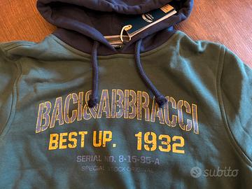 Una felpa con capouccio, colore verde con cappuccio blu, scritta di colore giallo.
