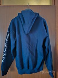 Felpa con cappuccio senza cerniera, brand N&T, blue con scritta "Washington DC" cucita sulla parte anteriore e sul braccio sinistro, taglia L (larghezza spalle 61 cm e lunghezza 70 cm), 80% cotone e 20% poliestere. Usata poche volte. In ottime condizioni.