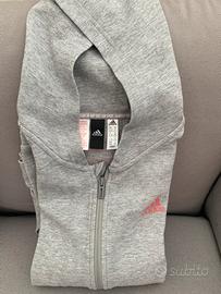 Felpa con cappuccio Adidas comoda con 2 tasche e zip lunga, inserti a strisce color Rosa chiaro in ottime condizioni usata poco da mia figlia. Tessuto di medio spessore, non felpata internamente.