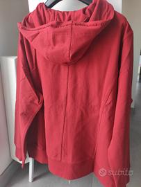 Felpa in cotone con cerniera, cappuccio e tasche sul davanti. Lungo la cerniera e sul bordo del cappuccio è arricchita da piccoli strass dello stesso colore della felpa. È nuova, mai indossata. La taglia è una XL.