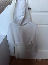 Bellissima felpa bianca modello cropped (taglio corto in vita) con cappuccio, perfetta per un look casual o per la palestra.