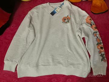 Vendo felpa da donna mai usata (con cartellino e confezione originale) colore grigio e motivo fiori su lato sinistro. Taglia M ma veste over-size quindi va bene 42/44 e 46 più aderente, tessuto caldo. Marca O'Neil