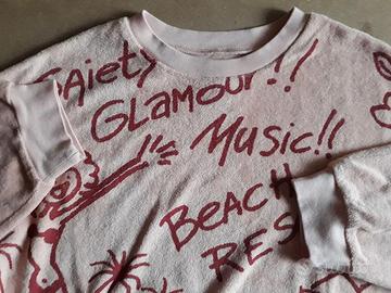 a maniche lunghe con scollo tondo in spugna di cotone color rosa con fantasia di stampa. Originale, mai indossata.