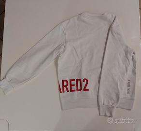 Felpa senza cappuccio Disquared2, bianca, con foglia a pallini blu e con scritta DISQUARED2 in rosso.