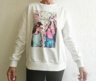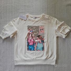 Felpa girocollo maniche lunghe, con stampa su sfondo di paillettes argentate. Taglia S. Nuova con cartellino. Marca Forpen.
