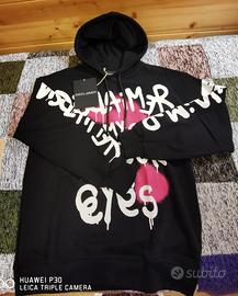 Felpa per donna/ragazza con cappuccio, nera, nuova con cartellino. Marca "Disclaimer", Tg. S (42-44). Colore nero/fuxia. Scritte e disegni gommati. Tessuto 100% cotone garzato. È un capo molto versatile. Ottima per la primavera, indossata con sneakers nere e jeans o pantaloni sportivi. Può essere indossata in primavera sotto un giubbino di jeans e anche nella stagione più fredda sotto un giubbottino più caldo e stivaletti. Veramente easy.