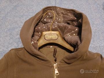 felpa da donna in cotone Manila Grace taglia M color nocciola con cerniera e cappuccio in paillettes