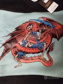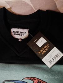 Design: Grande grafica centrale con iconico mietitore e drago. Patch "Doomsday Society est. 2012" cucita sul bordo inferiore.