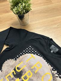 Stampa con teschio e scritta gialla a contrasto, stile streetwear.