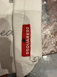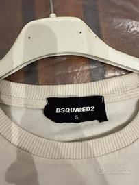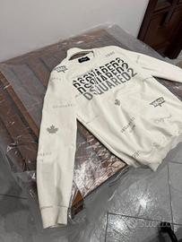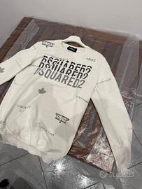Vendo felpa DSQUARED2 originale, color panna con stampa multilogo frontale e dettagli "DSQ2", "1995", "ICON", e foglia d'acero. Stile streetwear di forte impatto visivo, perfetta per chi ama la moda urban e i brand di lusso.