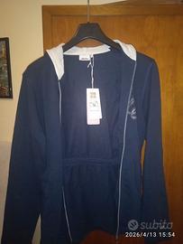 Vendo bellissima felpa con cappuccio firmata Ellesse, colore blu navy scuro, originale (come da etichetta in foto). Il capo è caratterizzato da un design femminile e ricercato, ideale sia per lo sport che per un look casual quotidiano. Caratteristiche principali: Brand: Ellesse (Collezione Retro) Taglia: XL (Donna) Dettaglio unico: Coulisse elastica interna in vita che permette di sfiancare il capo, valorizzando la silhouette e dando un tocco più elegante rispetto alle classiche felpe dritte. Dettagli estetici: Logo Ellesse ricamato sul petto con finitura argentata/glitter e piccoli dettagli metallici sulle coulisse del cappuccio. Condizioni: Nuova mai indossata ancora il cartellino. Prezzo di listino: € 74,99 La felpa ha una vestibilità comoda ma sagomata grazie all'elastico posteriore. Perfetta per chi cerca un capo sportivo ma con un taglio femminile.