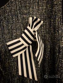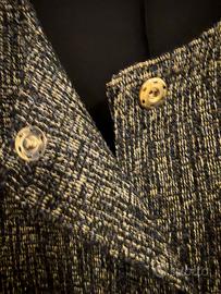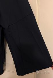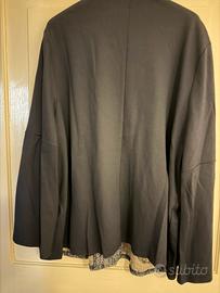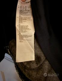 Mai indossata, solo provata taglia xl curvy tasche e bottoni a scomparsa, maniche un po’ a campana da ascella ad ascella 65 cm lunghezza 70 cm il retro e’ elastico, la spilla si puo’ togliere colore tra nero grigio e blu