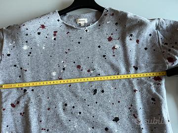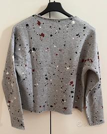 Felpina garzata corta girocollo, taglia S. Colore di base grigio con motivo a macchioline.