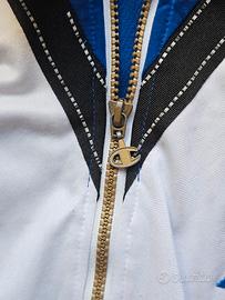 Presenta dei piccolissimi fili tirati sulla spalla e normale usura generale, indossabile tranquillamente.