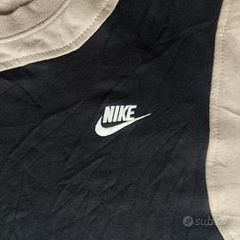 Felpa girocollo NIKE originale, caratterizzata da un distintivo design a blocchi di colore (color block) che unisce il beige / marrone chiaro e nero con una linea curva e asimmetrica. Un modello che richiama l'estetica sportswear e athleisure, ideale per un look moderno e minimalista.