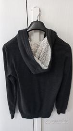 Felpa grigio scuro con accerniera, tasche laterali e cappuccio felpato bianco all'interno. Taglia Medium. Marca Alcott. Tessuto misto cotone e poliestere. Usata poco ma tessuto presenta segni del lavaggio e manca il cordoncino per stringere il cappuccio. Tenuta in buone condizioni appesa nell'armadio.