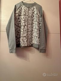 Felpa grigia con pizzo applicato sul davanti, misura da ascella ad ascella cm 56, lunghezza cm 65.