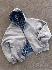 Felpa grigia con zip frontale e cappuccio, caratterizzata da interno a fantasia scozzese blu che la rende particolare e diversa dal solito. Vestibilità comoda, calda e adatta a look streetwear o casual. 🔹 Colore esterno: grigio 🔹 Interno: tessuto scozzese blu 🔹 Chiusura: zip 🔹 Cappuccio foderato 🔹 Condizioni: nuova