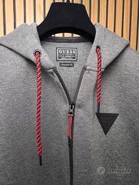 Felpa da uomo con zip frontale e cappuccio in un elegante grigio scuro. Realizzata in un tessuto misto, ha una mano leggermente rigida ma comoda, che mantiene la forma e non si stropiccia, donando un aspetto più elegante rispetto alle classiche felpe in cotone. Il capo è arricchito da cordini a contrasto in rosso e nero, che aggiungono un tocco sportivo e contemporaneo. Tasche con zip nere, e logo triangolare tono su tono sul petto.