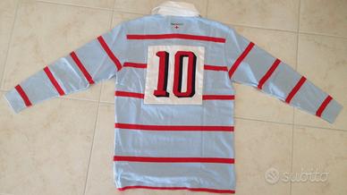 Felpa Hackett London, taglia small, cotone, a riighe, colore celeste e rosso, tipo rugby, usata, in buone condizioni. Logo ricamato e numero 10 in tessuto applicato posteriormente. Come visibile in foto, presenta delle piccole macchie sulla manica sinistra e in corrispondenza del collo (queste nascoste dal colletto).