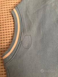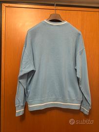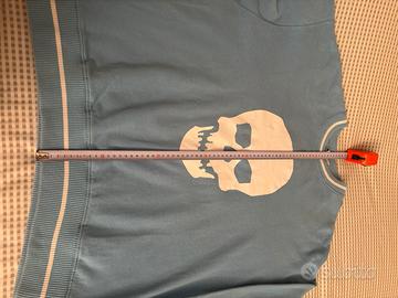 Simpatica felpa invernale in cotone 100% felpato Subdued celeste e bianca unisex, taglia unica, decorata con grande teschio bianco sul petto. Misure: lunghezza cm. 67, larghezza spalle cm.63, metà larghezza sotto ascelle cm.65, lunghezza manica cm.53 dal giromanica e cm. 78 dal colletto al polso. Usata pochissimo, presenta un piccolissimo rammendo sotto il collo, sopra le spalle, come indicato nella foto, ma in ottime condizioni.